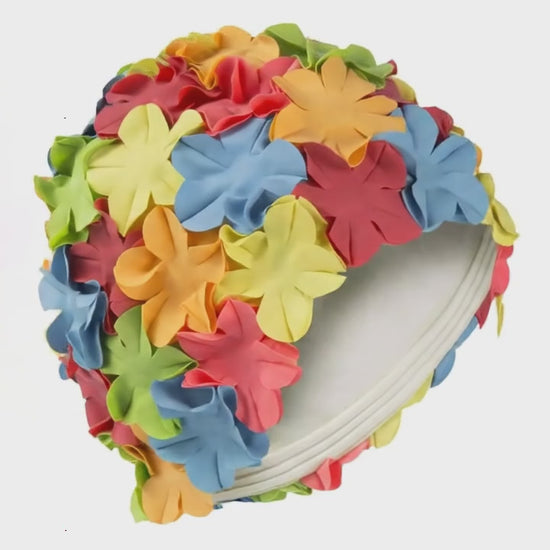 Add a splash of retro splash to your swim with this vibrant, multi-coloured floral swimming cap. Designed for both style and practicality, it helps protect your hair from the harmful effects of chlorine while keeping you looking effortlessly chic.